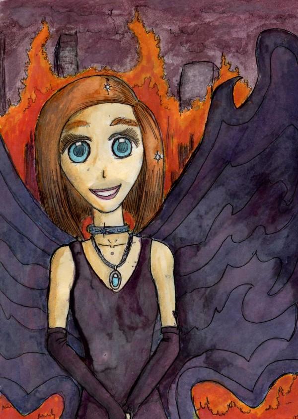 Here is the colored version of the very first picture of the Dark Fairy, enjoying herself over the prospect of bringing fire and destruction to the dwellings of humans. She has her reasons.