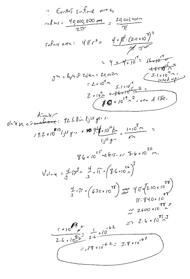 ***I did it, though I initially made a mistake in calculating the surface area of the Earth, as you can see below if you look closely (I forgot to square pi in the denominator). Anyway, assuming that the depth-to-height range of life on Earth is about 20 km, then the volume for life as we know it is about 1 x 10^19 cubic meters. The volume of the visible universe on the other hand is 2.6 x 10^81 cubic meters (if my calculations are correct). That means that the fraction of the universe that is, to our knowledge, amenable to life is 3.8 x 10^(-63), or 0.0000000000000000000000000000000000000000000000000000000000000038 of the volume of the universe. By comparison, the fraction of your volume represented by one of your tens of trillions of cells is roughly 10^(-12), or .000000000001. You lose thousands of cells every proverbial time you scratch your nose. How much do you notice them? How much less would the universe notice if it scratched all life off?